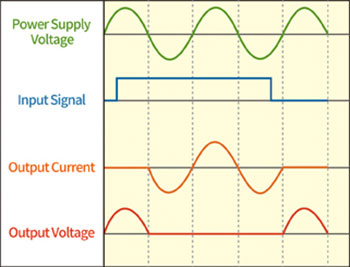 The relay switches ON/OFF when the voltage reaches the zero-crossing point of the sine wave.