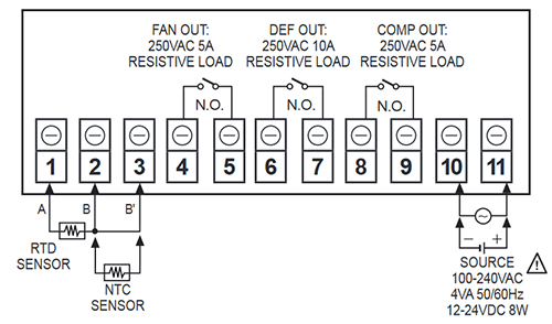 Temp Control, W72 x H36mm, 3 digit display, compressor output, defrost output, RTD, 100-240 VAC