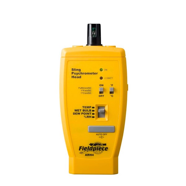 Fieldpiece ARH4 Digital Psychrometer Accessory Head measures both relative humidity and ambient air temperature. It calculates dew point and wet bulb. It’s great for calculating target superheat as well as logging %RH, temp, WB or DP over time. The head converts %RH, ambient temperature, dew point temperature, and wet bulb temperature to a voltage at a rate of 1 %RH or degree to 1mVDC and your reading is displayed on your meter. The ARH4 snaps directly onto Fieldpiece stick meters, data logger, electronic handles and adapters.