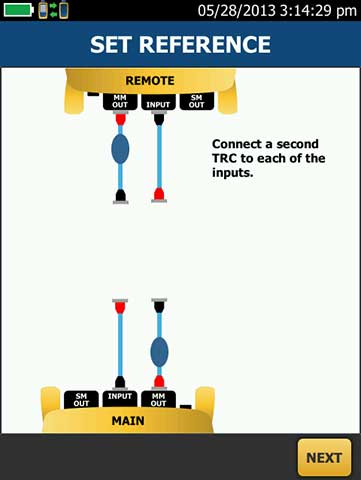 Setting a reference no longer has to be a challenge. The CertiFiber Pro OLTS has set a reference wizard function to guide the technician through setting a reference and checking test reference cords. The animated set-up helps reduce optical loss testing set-up errors that often result in confusing negative loss readings.