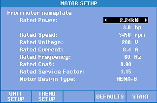 Input details of the motor from the rating plate including rated power, rated speed and motor type from either NEMA or IEC classifications.