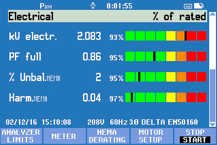 The easy to understand four-level color severity scale indicates motor performance in relation to the recommended electrical parameter levels including rated power, power factor, unbalance and harmonics.