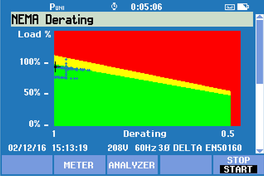 The NEMA derating screen is updated as the load and the electrical conditions change, and each new measurement is plotted on the tolerance graph as a “+”. In this example we can see that motor is within tolerance but is close to the service factor. This indicates that there may be a need for power quality mitigation, motor main - tenance or some other performance improving adjustment. By frequently performing these tests over time, known benchmarks and performance trends can be created, enabling informed maintenance investment decisions