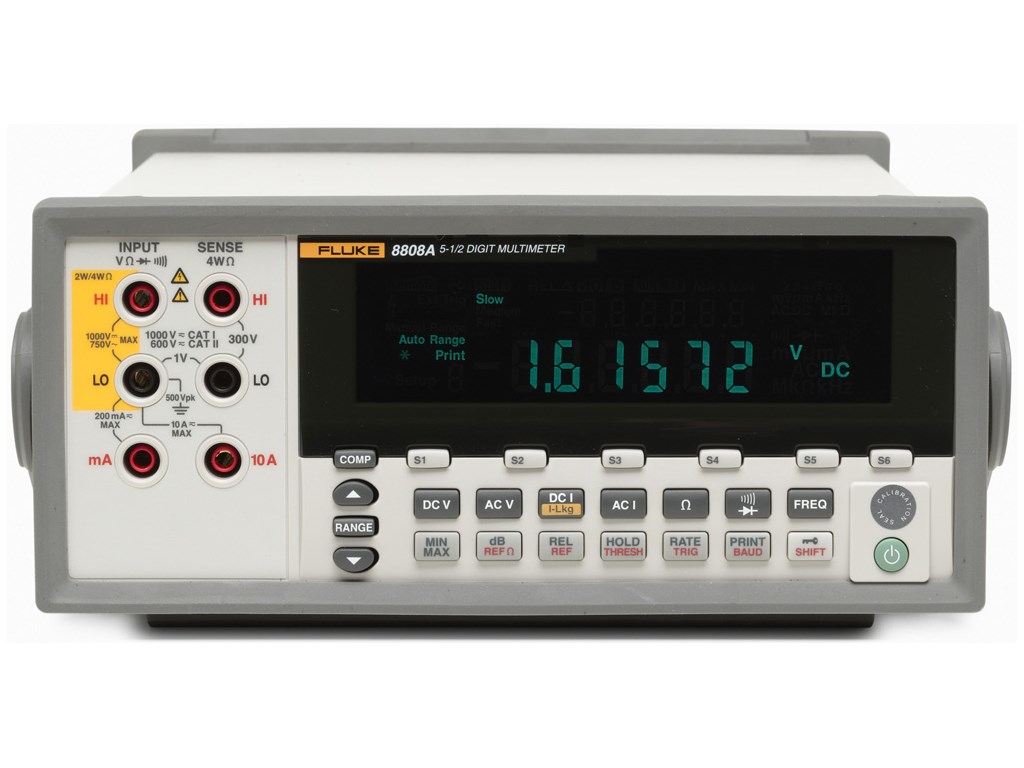 The Fluke 8808A 5.5 Digit Multimeter has a broad range of functions, measuring volts, ohms and amps with a basic V dc accuracy of 0.01 %. It is remarkably easy to use, even by unskilled operators, because it makes the measurements you perform most often extremely easy and fast to do.