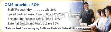 | | Improve your IT organization, not just network performance OMS helps network staff and management more effectively manage daily operations, ensure uptime, optimize assets and ensure compliance. With IT meeting departmental objectives, the organization is that much closer to meeting its overall objectives, from increasing productivity to reducing risk, from improving asset utilization to lowering costs. | Return on investment, return of sanity. Before making any investment in new tools, it only makes sense to study the return on investment. In addition to an impressive ROI, OptiView Management Suite delivers unprecedented ROS – Return of Sanity. Because engineers can get the complete picture across their network, as well as in-depth analysis “on-the-wire,” the networking staff is able to solve more problems faster, improving the productivity of the entire workforce. By being proactive – instead of reactive – staff can work to ensure that performance is enhanced across the enterprise. With network management more efficient and effective, engineers are able to provide management with a clearer understanding of overall performance. Managing the network with fewer vendors and fewer tools simplifies support and training. All of which results in peace of mind for network engineers on the front lines and managers behind the scenes. | |