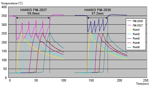 | Test method | Solder at 5 points and measure the time until temperature of the workipiece reaches 250 degrees. |