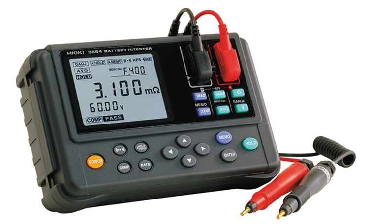 The 3554 BATTERY HiTESTER is a measuring instrument for judging battery wear by measuring internal resistance, voltage, and terminal temperature* of lead-acid, nickel-cadmium, nickel-hydrogen, lithium-ion, and other types of batteries.