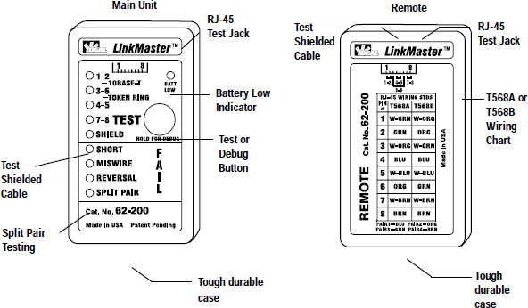 Tests wiring configurations on UTP/STP cables. Checks for shorts, miswires, reversals and split pairs. Debug feature, automatic shut-off and low battery LED indication.