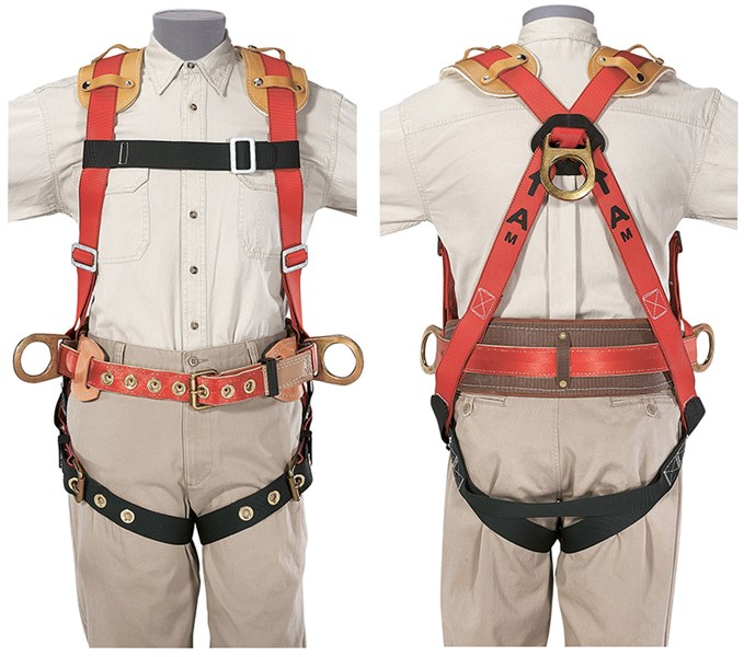 • Fall-arrest/positioning harnesses are designed to arrest free falls and distribute impact forces over thighs, pelvis, chest and shoulders as required by OSHA