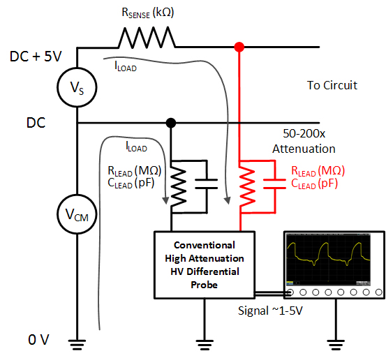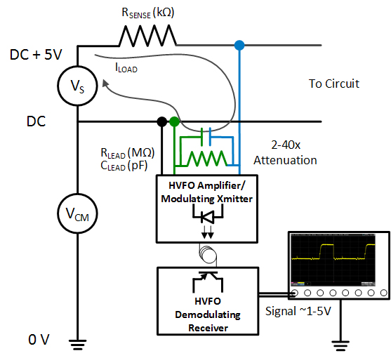 The HVFO measures only the low voltage sensor voltage across its high impedance input leads. Total load on the device under test (DUT) is very small. Furthermore, the low lead loop inductance, >100dB CMRR, and low attenuation provide superior signal fidelity, noise and rejection.