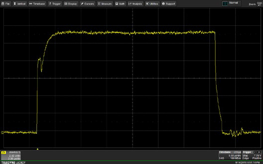 | The HVFO (yellow trace) and a conventional HV differential probe (blue trace) capture an upper-side gate drive signal. The HVFO exhibits a classic, textbook shape while the HV differential probe has more loading and lower-side device high dV/dt signal interference. |