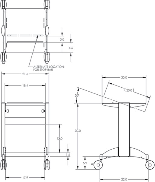 This cart contains an adjustable shelf, four high quality casters, and is ideal for oscilloscopes such as the WaveMaster/SDA/DDA 8 Zi/Zi-A. All dimensions are in US inches. |