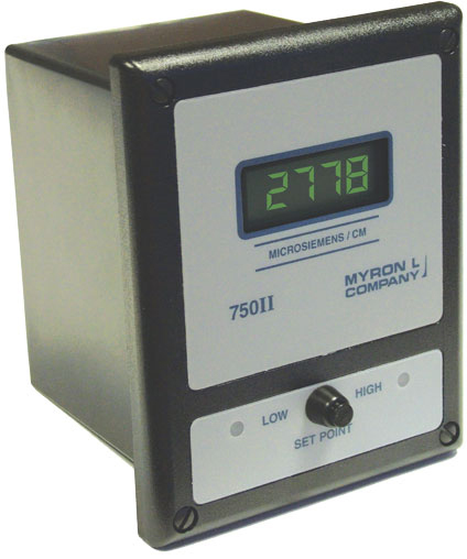 Built-in electronic calibration allows for fast quality checks without standard solutions. (Note: for maximum system accuracy standard solutions are recommended). A push-to-test button makes setpoint checks easy, while the internal alarm set discourages unauthorized adjustments. Standard on all controller models is a heavy-duty 10 amp output relay, operating on either increasing or decreasing readings. Bright green/red LEDs indicate above or below setpoint readings. All 750 Series II models feature an IP65/ NEMA 4X water resistant and corrosion-proof rated enclosure. Compact in size at 152 x 122 mm/6 x 4.8 in., they are suitable for panel, bench or surface mounting.