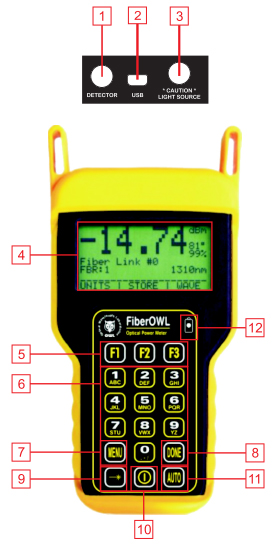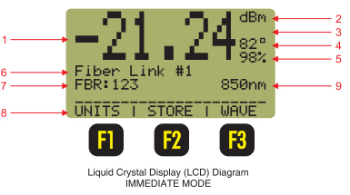 - LCD Display - shows optical power/loss levels, power units, temperature, battery life, wavelength, and circuit ID information.