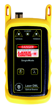 The Laser OWL 1550 singlemode laser source provides high output and stability in an economical price. The laser diode uses a temperature compensated output and is calibrated to couple -10dBm of optical power into singlemode fiber. The source is simple to operate with an intuitive 2-button interface - one button to control power and the other to select output wavelength. LED indicators highlight the selected source and verify that battery power is sufficient to maintain the calibrated output power. The Laser OWL 1550 is a laser-based light source designed to test singlemode fiber optic links. The LED indicator shows whether the unit is ON or OFF, and whether the battery has enough power to maintain its calibrated output power. Its 1550nm light sources provide stabilized testing that conforms to international testing standards. Lasers such as the ones in Laser OWL 1550 light sources produce intense beams of infrared energy that are invisible to the eye. NEVER LOOK INTO A LIGHT SOURCE OR THE END OF A FIBER THAT MAY BE ENERGIZED BY A SOURCE! Exposure to such energy can cause serious retina damage, and prolonged exposure can cause blindness.