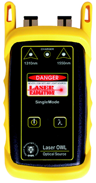 The Laser OWL is a laser-based light source designed to test singlemode fiber optic links. The LED indicator shows whether the unit is ON or OFF, and whether the battery has enough power to maintain its calibrated output power. Its dual-wavelength 1310 and 1550nm light sources provide dual wavelength testing that conforms to international testing standards. Lasers such as the ones in Laser OWL light sources produce intense beams of infrared energy that are invisible to the eye.