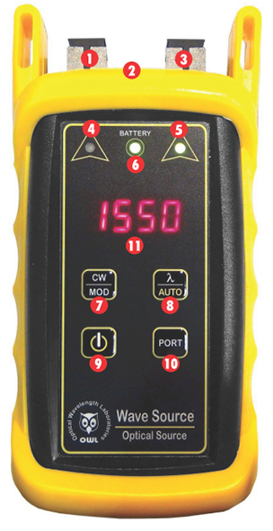 - Wavelength/AUTO button - press the button to change the output wavelength for the selected port; hold the button to set the unit into AUTO mode (i.e. if two wavelengths are present, the source will alternate between these two wavelengths). When activating AUTO mode, the display will indicate AUTO
