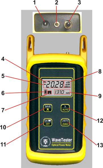 - AUTO button - Press this button to change wavelengths. Hold this button to set the meter in AUTO mode. AUTO mode scans incoming power for modulated optical signals, and switches wavelengths automatically when a corresponding modulated signal is received (for use with WaveSource light sources only.)