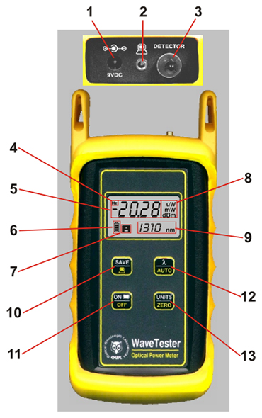 - AUTO button - Press this button to change wavelengths. Hold this button to set the meter in AUTO mode. AUTO mode scans incoming power for modulated optical signals, and switches wavelengths automatically when a corresponding modulated signal is received (for use with WaveSource light sources only.)
