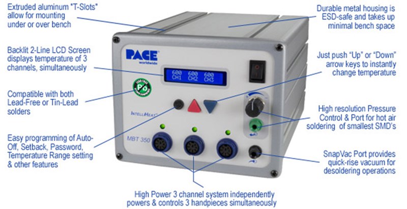 I have used PACE soldering & desoldering equipment for many years.The quality of their products is outstanding.I have an MBT201 desoldering station, and it's still running -iIt has been in service every day, for almost 15 years!I can still get spare parts for it and professional technical assistance over the phone.I'm very happy with the MBT350 systems we've purchased, I can say that the quality is still there. It's a wonderful all-in-one station for performing through-hole work. I've also managed to perform a substantial amount of SMD rework (passive SMD components, SOIC, SOT etc). The temperature controls are very precise, the tools are very comfortable to utilize.