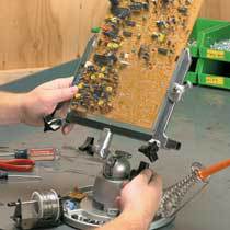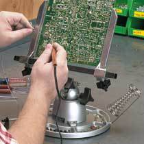 PanaVise Circuit Board Holders help you work quicker and smarter. The two moveable arms extend 6" (154mm) from the cross bar and have "V" shaped grooves which securely hold the board edge. One arm is spring tensioned to equalize holding pressure, and includes a new lever which locks the internal spring "open" for quick board insertion and removal. "V" notches positioned laterally near the arm tips securely and conveniently hold small electronic parts. All our vises and work holding devices come with a "lifetime warranty."