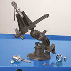 Vacuum Base PV Jr. shown on a metal work surface. A vise that tilts, turns, and rotates that you can take almost anywhere.