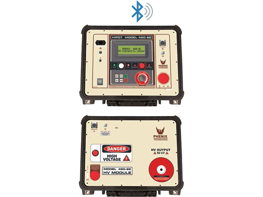 The model 460-6E smart DC hipot is a cutting-edge dielectric test instrument designed with an emphasis on operator safety, versatility and ease of use. Complying with the most rigorous safety requirements, the system is divided into two modules, a control unit and a high voltage generation unit. Additional safety features include an emergency stop switch and a built-in sound alarm. Furthermore, the ability to fully remote control the instrument from an Android device — both to program the settings as well as to perform the tests — provides increased safety protection and greater comfort for the operator. A built-in microprocessor allows the user to adjust the output voltage, test duration, maximum leakage current and ramp slope, allowing for more complex tests to be carried out automatically