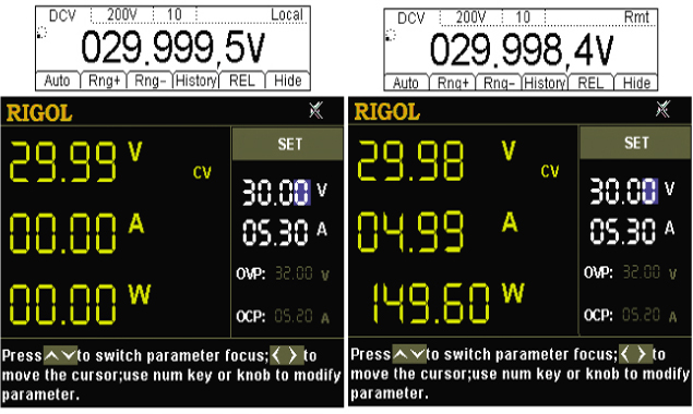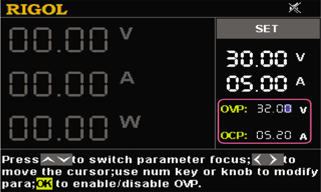 You can set thresholds for OVP and OCP values. If overvoltage or overcurrent occurs, the power supply shuts down the output automatically, and then a prompt message is displayed. |