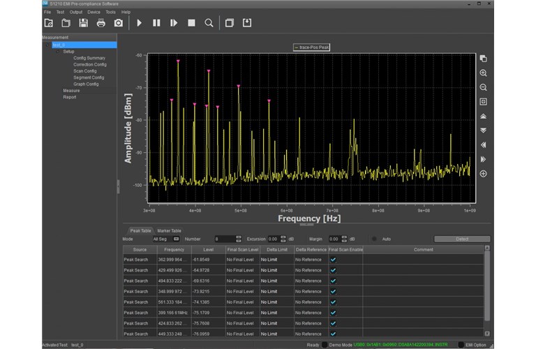 The S1210 EMI Pre-compliance Software is a PC application software developed by RIGOL for DSA1000A, DSA1000, DSA800 and DSA800E (with the EMI-DSA800 option) with the EMI function. This software is designed on the basis of the standard drive VISA and you can realize the communication between the software and instrument via USB-TMC or LAN interface to control the instrument.