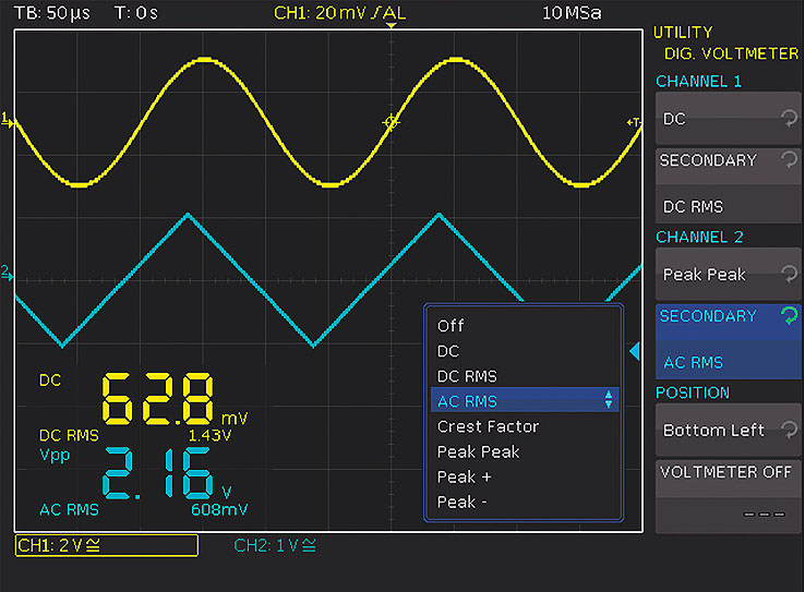 DC, DC rms , AC rms , V pp , V p+ , V p -, crest factor |