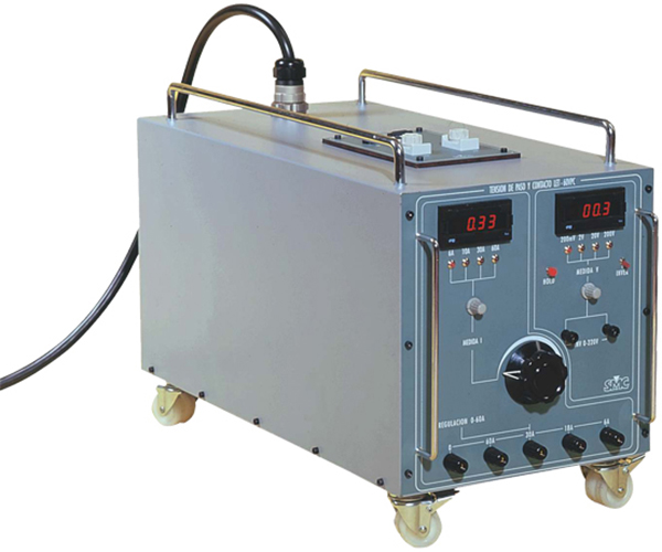 The sets contain two distinct functions, the current injection and the voltage measurement. The current regulation and production system consists of a continuous regulation autotransformer which drives a toroidal transformer designed for short-circuit duty so that the desired current is produced. This system of current injection makes possible to shift the current 180° in order to avoid possible stray current over the ground. The voltage in step and touch measurement is made up with a digital voltmeter of 3 1/2 digits with a input designed so that the ohm resistance will be 1 KΩ. The precision of this set is ±1%.