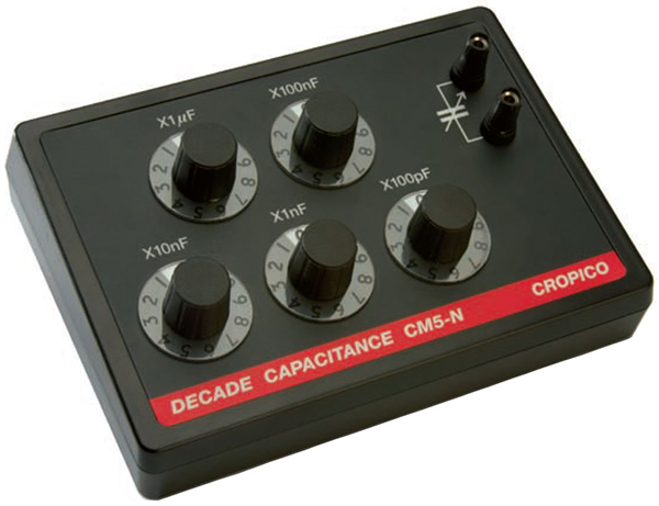A five decade capacitance box to complement the RM6-N range of resistance decades. Styled in the same ergonomic desk case, the CM5-N decade resistance box is a useful addition to any laboratory, as well as for industrial and educational use. The required capacitance is set by means of rotary switches with skirted knobs and stators giving a clear indication of the dial setting. The capacitors are a combination of polycarbonate and polystyrene, generously rated minimum 160 Vdc with a good dissipation factor and high insulation. A useful feature of this unit is the residual capacitance being compensated for on the 10 x 100pF and 10 x 1nF dials so that the actual value of the dial setting appears at the terminals.