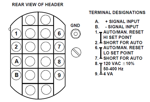 If Auto Reset is desired, simply connect a jumper between terminals 1 and 2 for the high set point or 6 and 7 for the low set point. If Manual Reset is desired, connect a normally-open SPST push button switch to the terminals as shown in the terminal designation diagram. On a dual set point unit, the Auto or Manual mode may be selected for