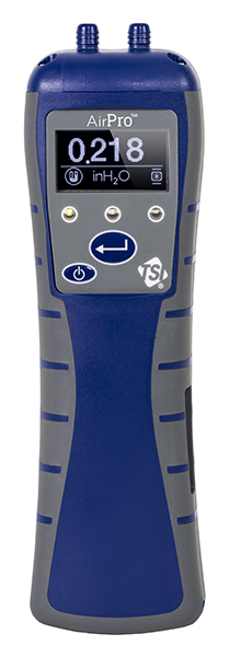 The AirPro Micromanometer AP800 is a rugged, compact, configurable and high performing component of the AirPro Solutions platform. It is used in conjunction with AirPro Mobile Application Software and user-defined feature sets. It includes a differential pressure sensor (with + and - ports) for differential and static pressure, barometric pressure sensor for air density correction, integrated display, two buttons (Power and Save) and a rechargeable lithium-ion battery; which can be charged via USB. It provides a subset of operational controls and reporting capabilities while utilizing Bluetooth Low Energy (BLE) to communicate wirelessly in real-time with the AirPro Mobile Application software - running on the user's preferred mobile hand held device. It also provides internal storage for use in long- or short-term unattended data logging applications via SD card.